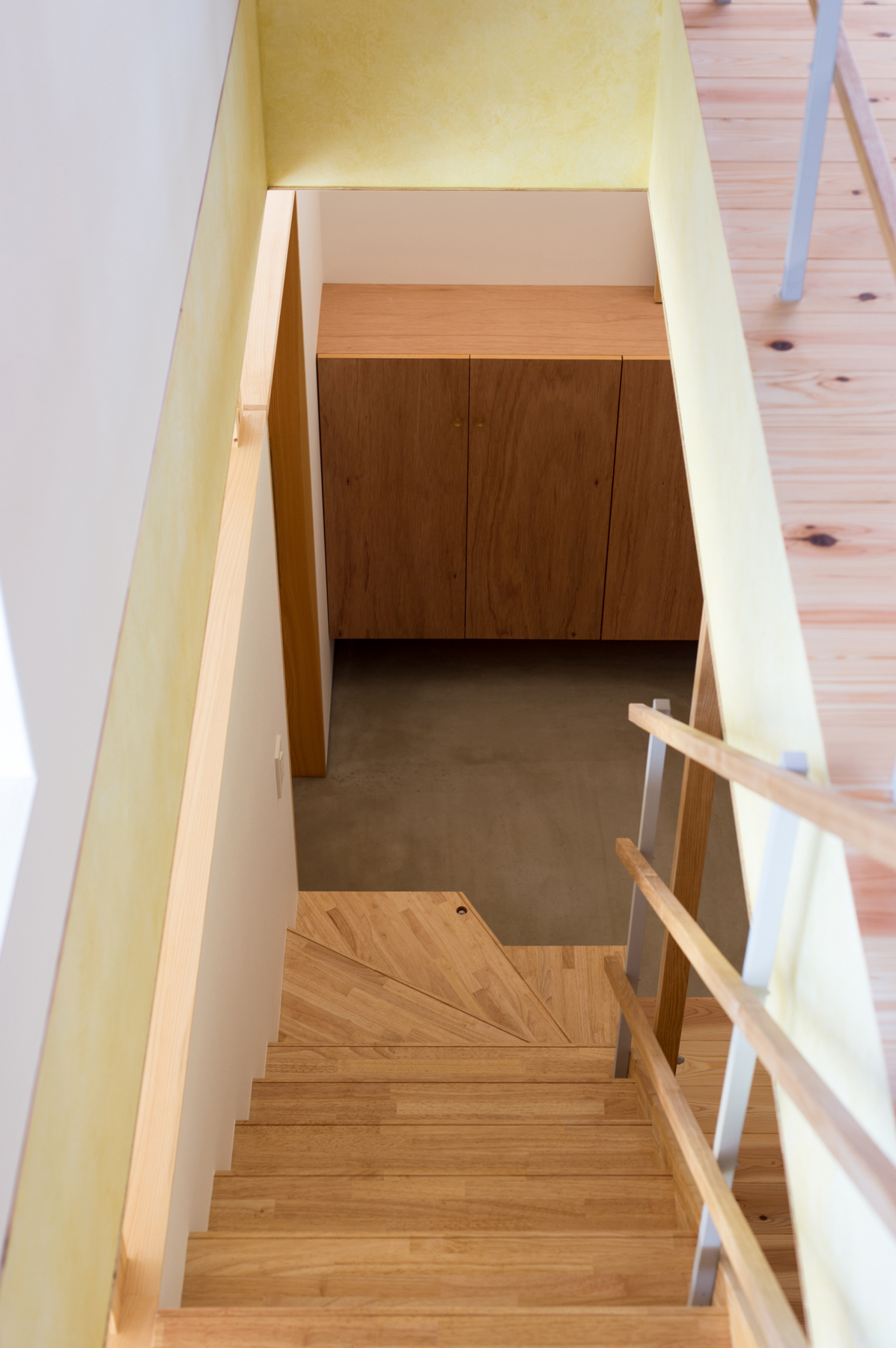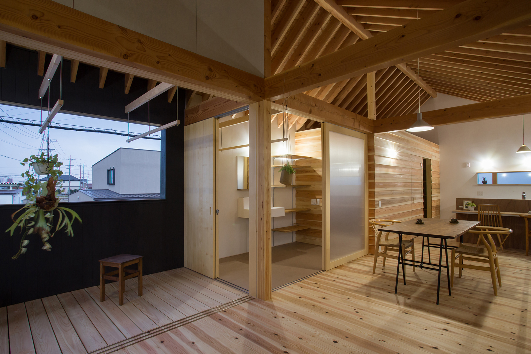 愛知県の地方にある市街化調整区域内の住宅の建て替え計画である。計画地では、道路や隣家と距離の近い1階高さに対して、2階高さからは周囲に広がる広大な田畑風景の眺望が期待できた。そのため、1階にはくつろぐための寝室のみを設け、それ以外の全ての居室を2階に計画した。2階では、LDK、洗面室、植物好きのお施主さんのためのサンルーム、バルコニーのそれぞれが大きなつながりを持ち、建具の開閉によって空間の大きさや内外の関係に多様さをもたらしている。