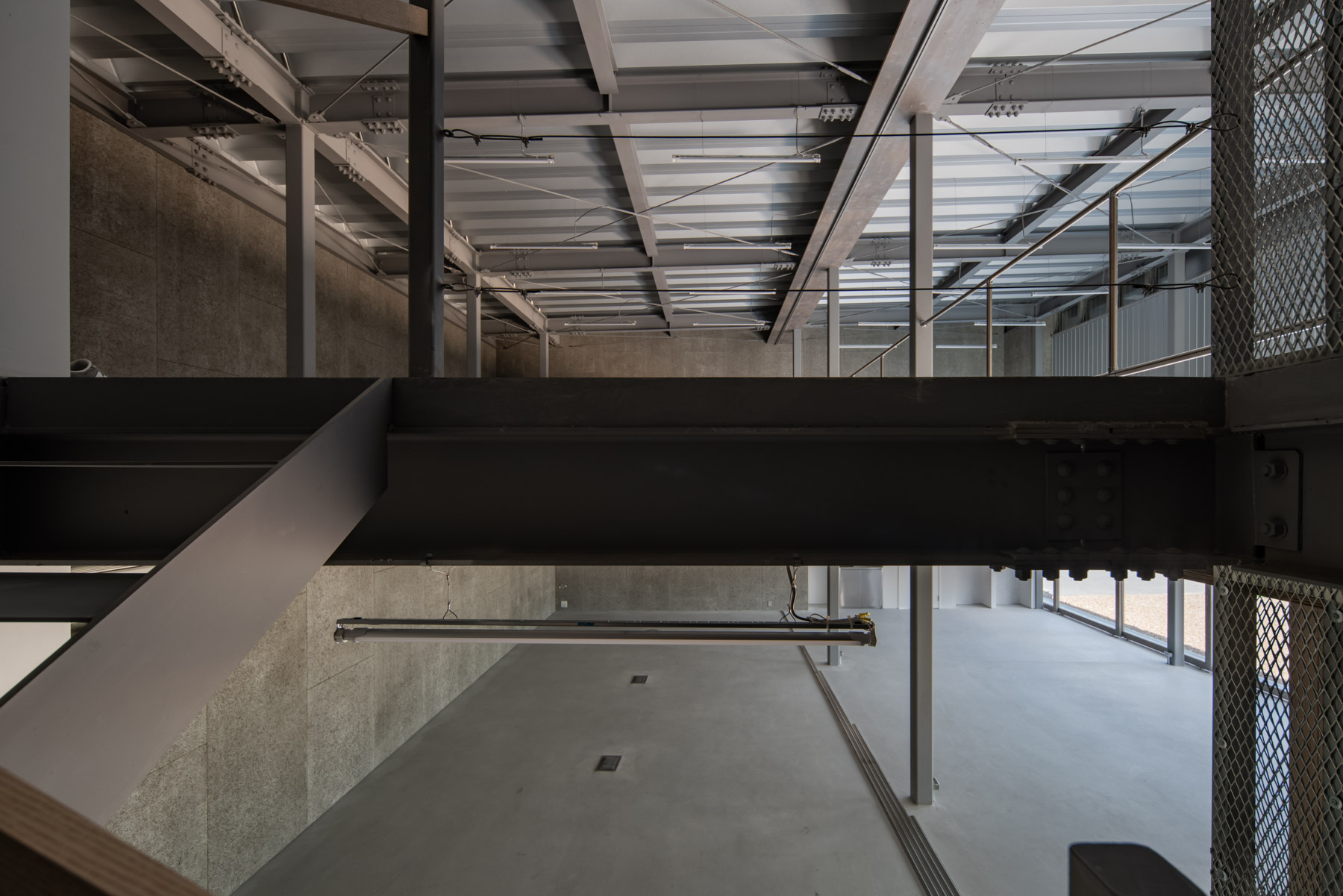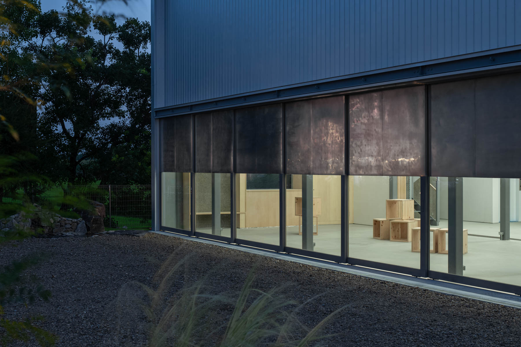 限られた土地・コストで最大限大きな容積を獲得するため、直方体のボリュームを考え、上記の敷地的特性から、庭、イベントのできる屋外スペース兼駐車場、ショップ、オフィス、倉庫を国道側から順に並べるように配置した。それぞれの境には植栽や築山、建具やカーテンがあり、バッファや領域を調整する役割を果たす。例えば、外部とショップの間の建具は下半分がガラス、上半分を鏡面としている。道路の車から内部の様子を伺い知ることができるが、内部からは植栽や、内部の風景の映り込みが目に入るようになっている。これらの設えがつくる層状の断面構成により、多様なイベントや使われ方の変化に対応できるよう計画している。