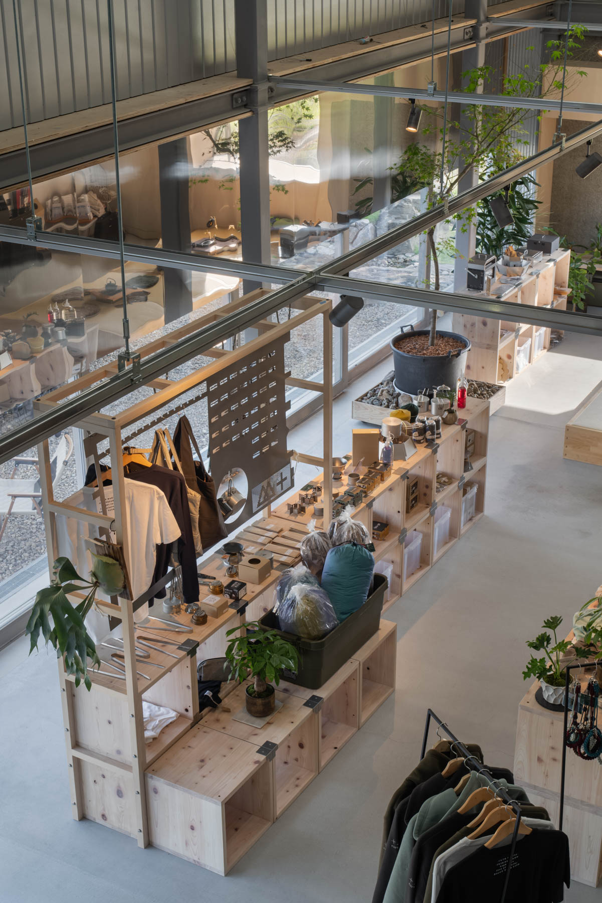 家具には岡崎市の山で採れた間伐材を使用している。約42cm角のロの字の箱に対してスタック用の金物を自社の技術で作成してもらい、自由に組み替えられる仕様である。商品展示以外にも、テーブル、椅子、本棚などとして高い汎用性をもつ。ロの字であることで、抜ける/抜けないの調整が可能であり、上述の建具等と並ぶひとつの設えとして位置付けている。